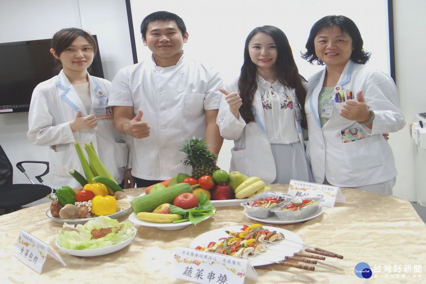 營養科主任劉美媛(右起)率營養師吳宜峰.餐廳主廚陳建羽及營養師劉珮芬等營養團隊教導民眾中秋節如何健康烤肉及DIY-C纖蔬果汁。