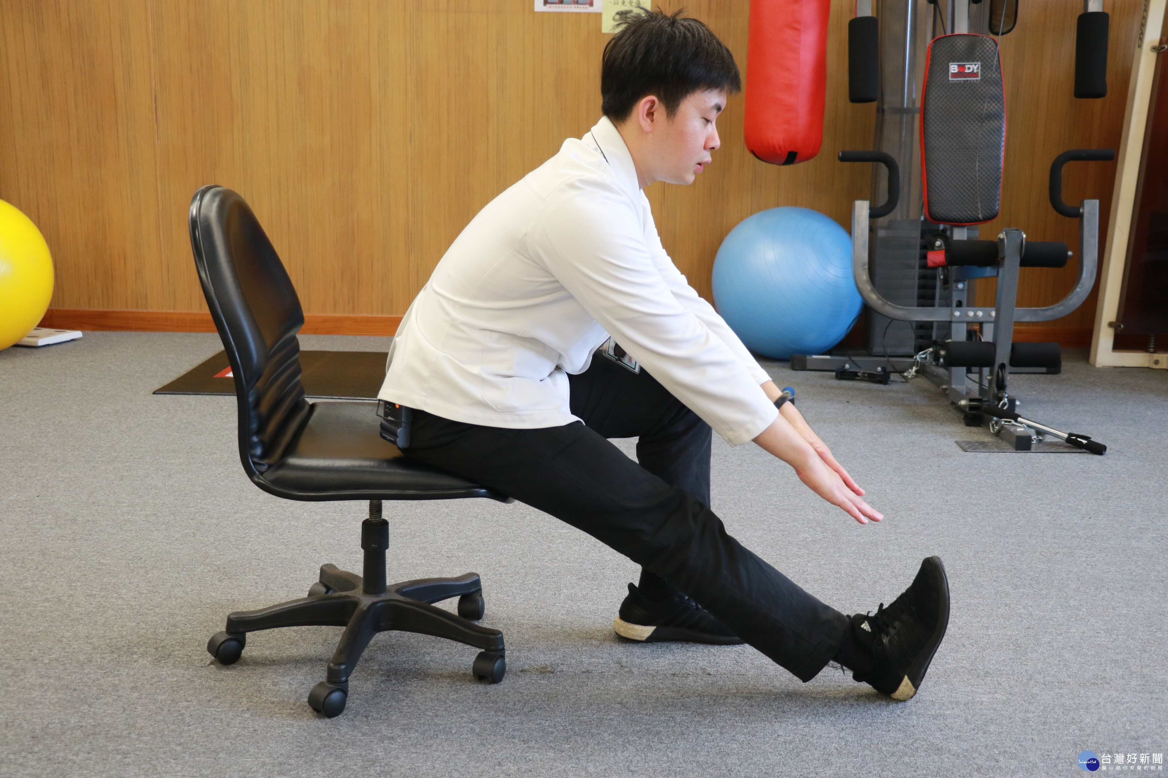 多數人以為坐著輕鬆,提醒,其實椎間盤壓 力坐比站大一點五倍,加上不平衡的坐姿會造成腰椎骨刺與椎間盤問 題。醫療團隊在父親節,設計六個簡易伸展操,讓久坐的爸爸們,多 動動為家人幸福維持健康。