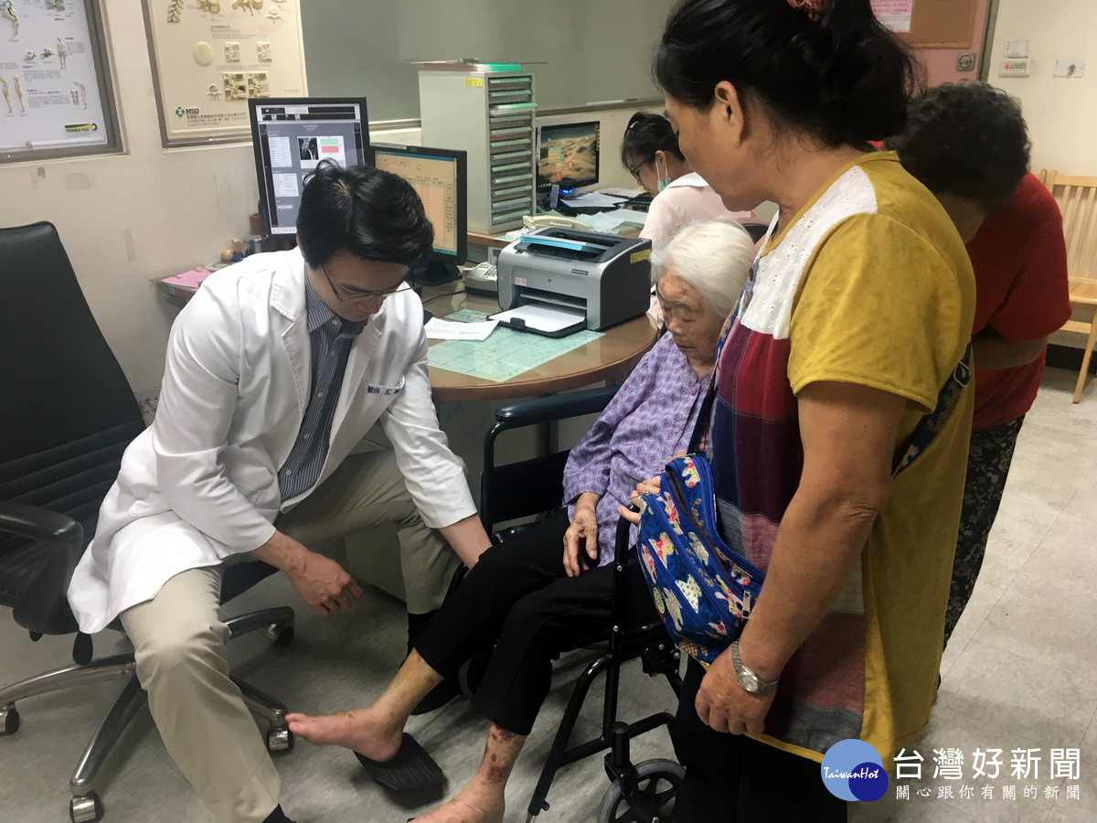 南投醫院骨科醫師王證琪檢視人瑞術後情形。