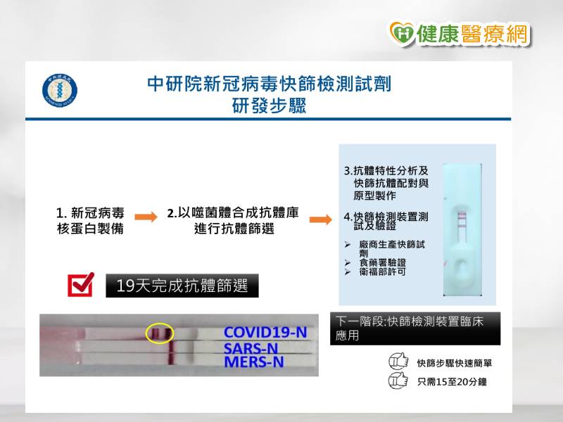 中研院基因體研究中心楊安綏研究員表示,快篩的關鍵在於其抗體試劑需能準確辨識新冠病毒。研究團隊在短短19天內,針對7種人類冠狀病毒核蛋白(Nucleocapsid protein)抗原,製造出第一批46株毫克等級產量的單株抗體(IgG),其中有1株抗體有極佳的單一辨識性,只對新冠病毒有反應,並不會與SARS、MERS病毒或其他導致一般感冒的冠狀病毒有交叉反應,可於快篩時有效判別是否感染新冠病毒。