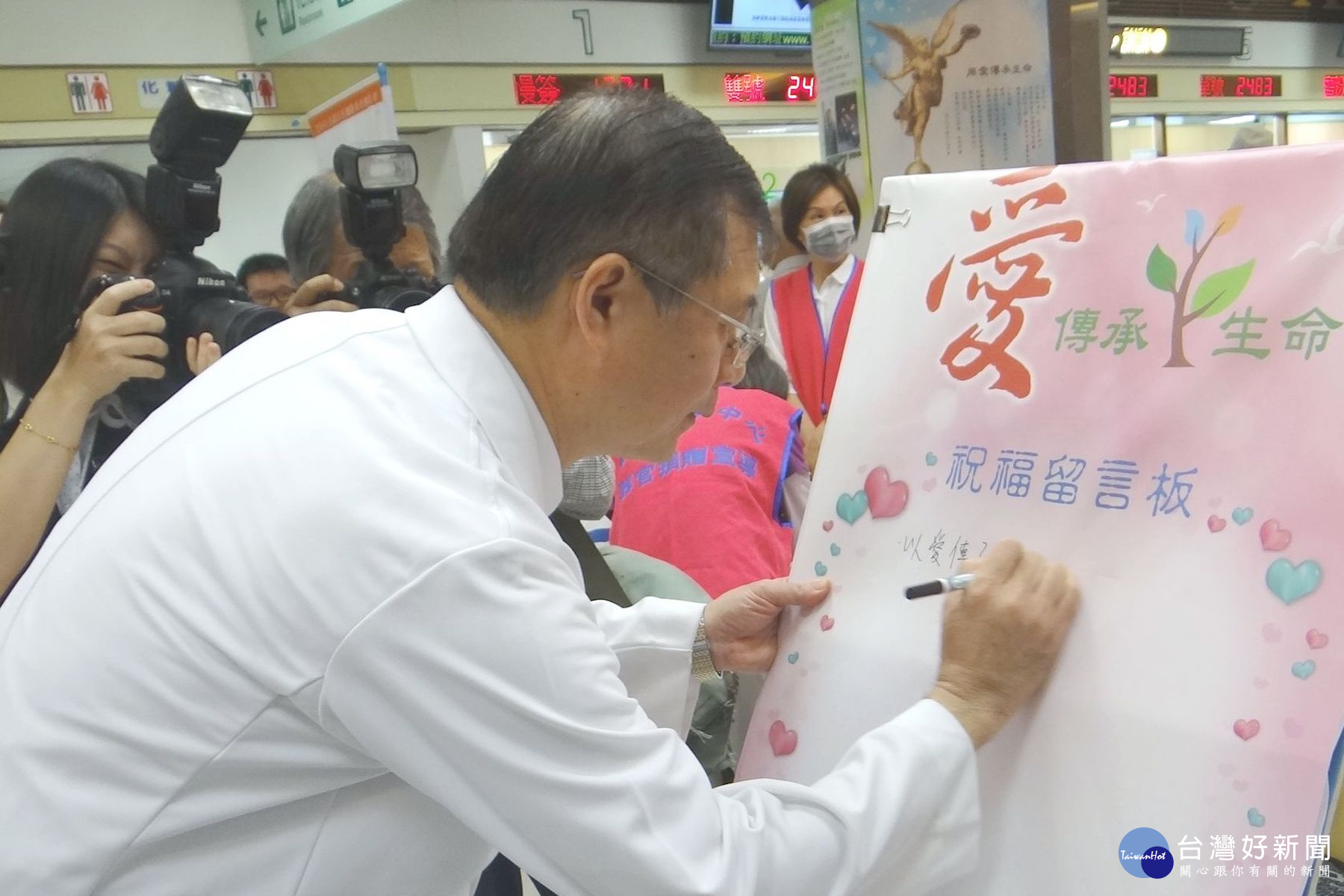 提升國人對器官捐贈的重視,並實際付諸行動,配合衛生福利部器官捐贈政策推廣宣導不遺餘力、積極推動器官勸募及捐贈宣導活動23日在第一醫療大樓一樓門診大廳舉辦器官捐贈宣導活動。奇美醫學中心器捐活動院長邱仲慶在祝福留言版上親自寫下祝福的話。