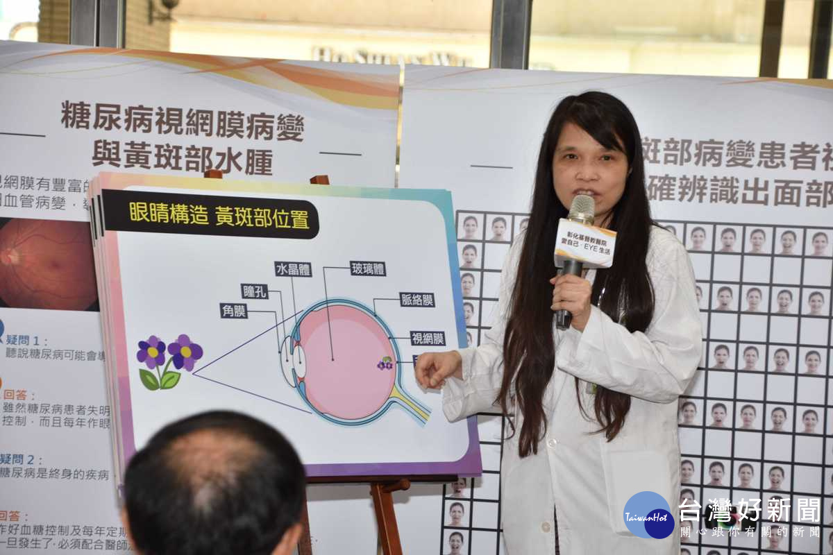 為提升民眾對「糖尿病黃斑部病變」的認識與預防,彰化基督教醫院即日起至11月03日止,為期一週於醫院大廳舉辦「愛自己‧EYE生活」衛教活動,現場陳列大型「阿姆斯勒方格表」以及多項衛教新知,藉此提醒民眾應早期發現和治療,43歲便罹患「糖尿病黃斑部病變」的補習班老師 – 黃小姐,出席衛教活動並現身說法。