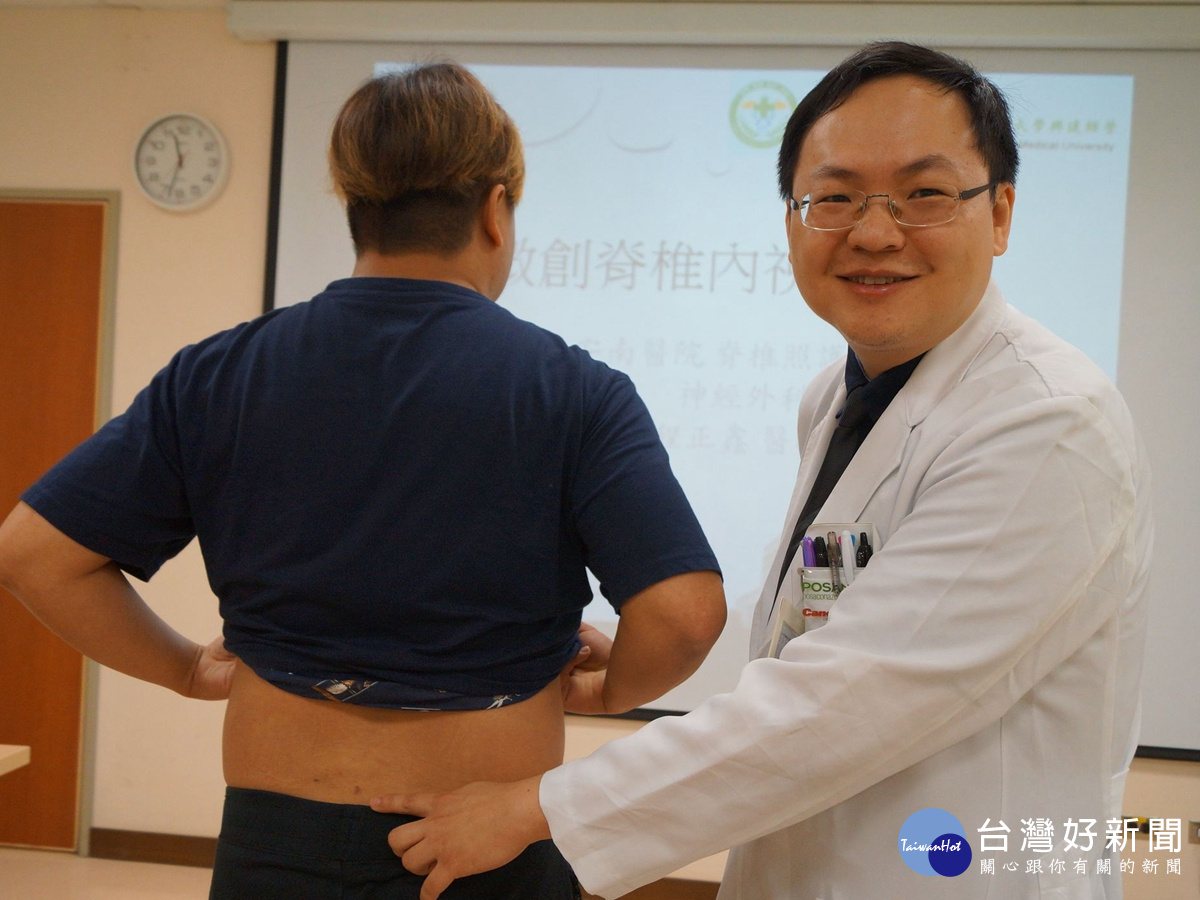 程正鑫醫師(右)施以35歲病人蘇先生(左)微創脊椎手術,傷口幾乎看不出。