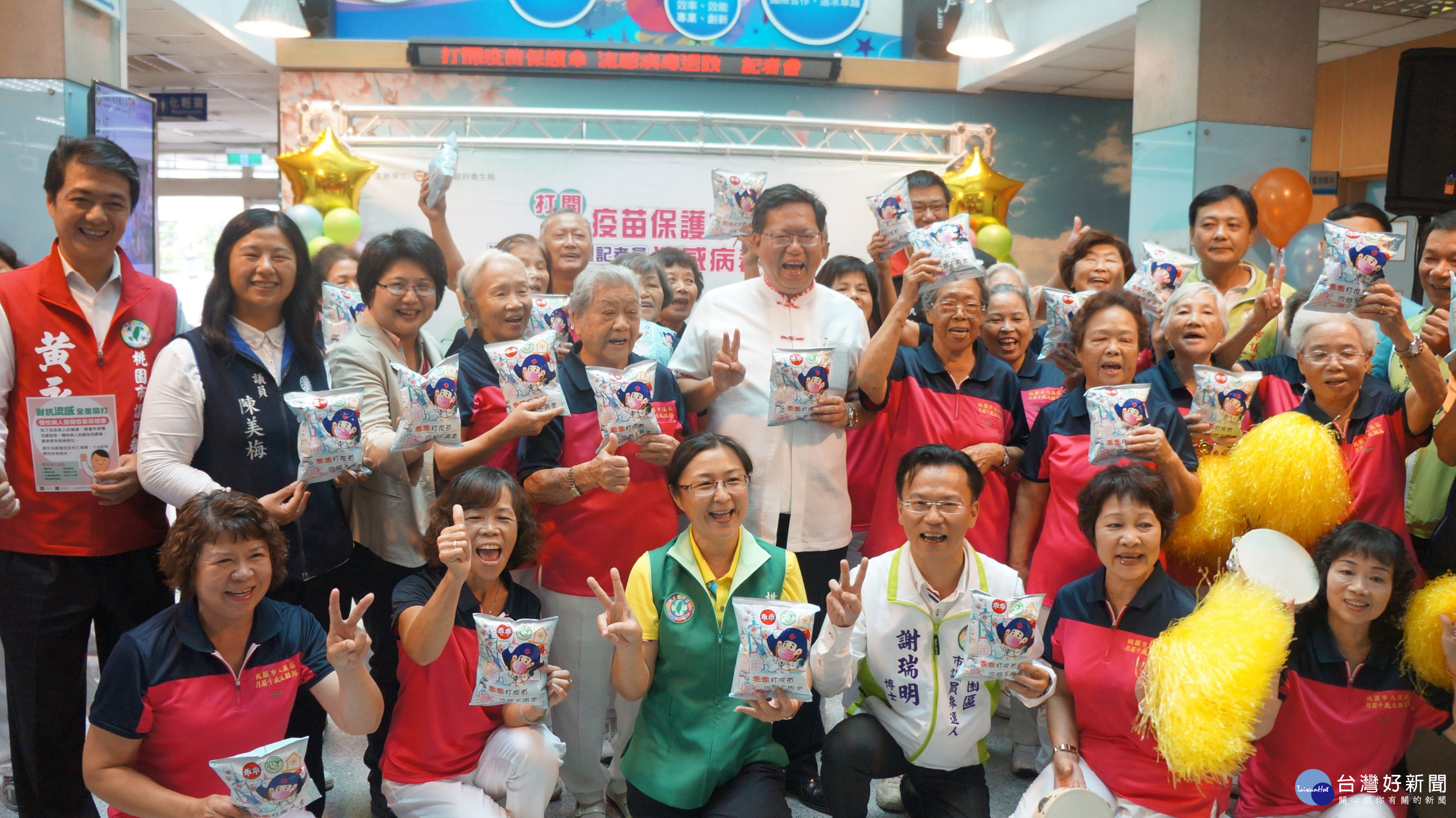 106年度公費流感疫苗已於10月1日起開始接種,桃園市政府於10月2日邀集社區長者們,與鄭文燦市長一同宣誓,呼籲市民挽袖施打,打開疫苗保護傘,共同打擊流感病毒,除保障自身健康外,也為家人、朋友提供最佳的保護。市議員陳美梅、陳治文、市府衛生局長蔡紫君均出席活動。