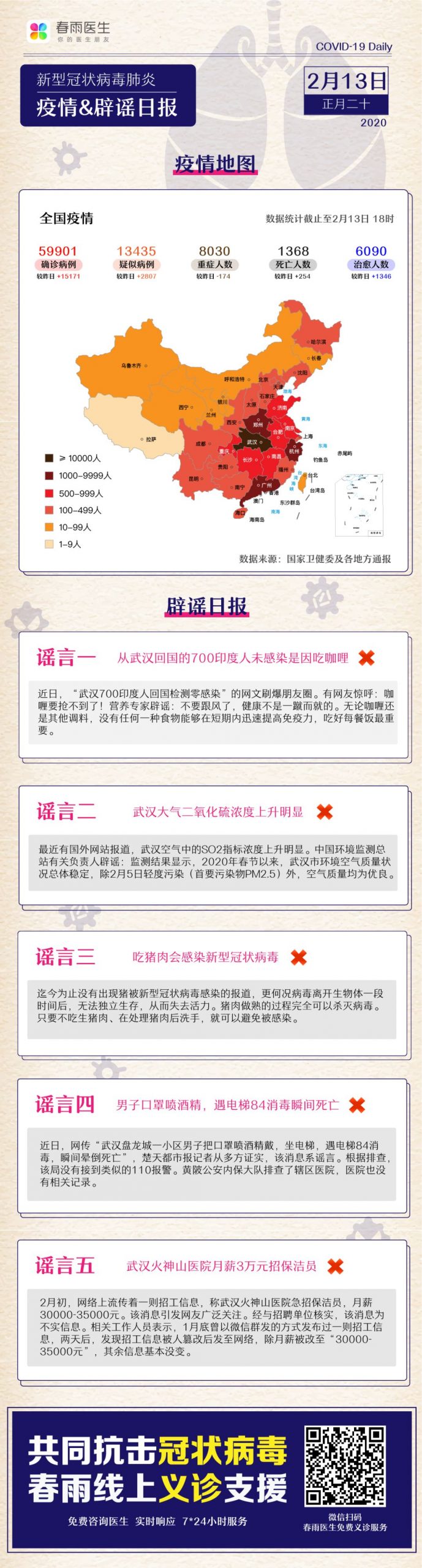 截至2月12日24時,據31個省(自治區、直轄市)和新疆生產建設兵團報告,現有確診病例52526例(其中重症病例8030例),累計治癒出院病例5911例,累計死亡病例1367例,累計報告確診病例59804例,現有疑似病例13435例。累計追蹤到密切接觸者471531人,尚在醫學觀察的密切接觸者181386人。