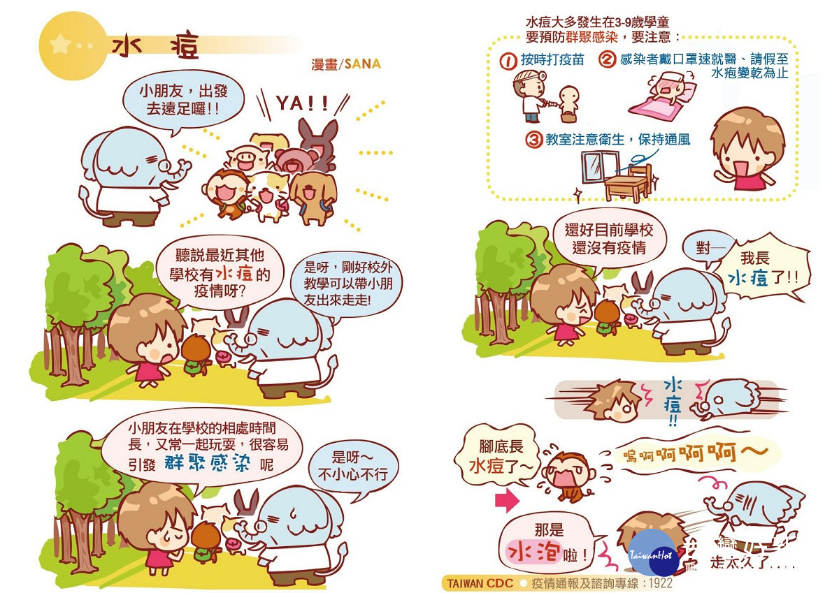 衛生局指出,水痘是由水痘帶狀皰疹病毒所引起,為高傳染性疾病,可經由皮膚接觸、空氣或飛沫、或水疱液和黏膜分泌物傳染,潛伏期約2至3週,小於1歲之嬰兒、孕婦、成人及免疫缺陷者為水痘併發症高危險群,容易併發繼發性細菌感染、肺炎、腦炎等及死亡。接種水痘疫苗是預防水痘最有效的方法,也能降低孩童及成人因感染水痘引發嚴重併發症的機會,提醒家長應於幼兒出生滿12個月時攜往合約院所完成水痘疫苗接種。