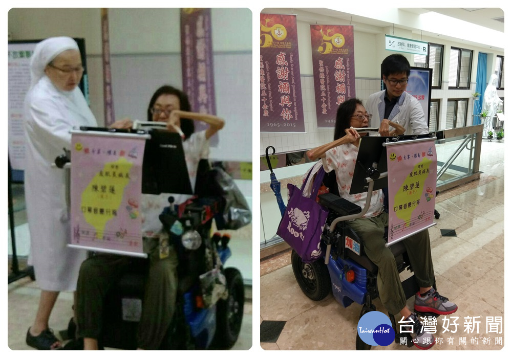 42歲不放棄夢想的生命勇士陳碧蓮女士,6月2日上午在大雨中從台北來到聖保祿醫院,此次來醫院不是看病,而是當音樂志工,落實「樂分享、環島夢、帶著口琴吹出愛」圓夢計劃。聖保祿醫院是她環島表演第9家醫院,帶著口琴,坐著電動輪椅,搭配火車,全台灣走一圈,分享輕鬆好聽的口琴,曲目如望春風、朋友歌、神隱少女等國、台、日語歌,吹給生病的病人、家屬及醫護人員聽,慰勞辛苦的工作人員。