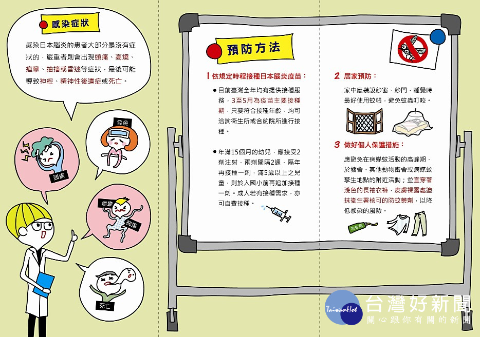 疾管署也呼籲家中適齡嬰幼兒,如未完成日本腦炎疫苗接種,也應儘速帶往鄰近衛生所或指定醫療院所完成接種,以避免感染及衍生嚴重後遺症。相關資訊可至疾管署全球資訊網()或撥打免付費防疫專線1922(或0800-001922)洽詢。