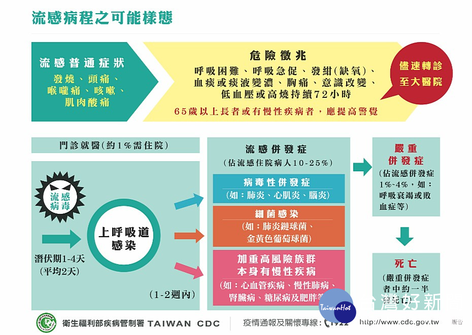疾管署指出,流感病毒主要透過飛沫傳播造成上呼吸道感染,潛伏期1至4天(平均約2天),主要症狀為發燒、頭痛、肌肉痛、疲倦、流鼻涕、喉嚨痛及咳嗽等,大多數患者經就醫服藥、休養後會自行痊癒,但65歲以上長者或具慢性疾病者為流感重症高危險群,應特別留意個人健康情形,一旦出現前述流感危險徵兆務必儘速至大醫院,以免引發重症或死亡。
