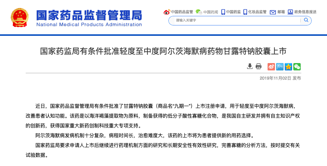 [1]國家藥品監督管理局,國家葯監局有條件批准輕度至中度阿爾茨海默病藥物甘露特鈉膠囊上市,2019-11-02,http://www.nmpa.gov.cn/WS04/CL2168/359779.html