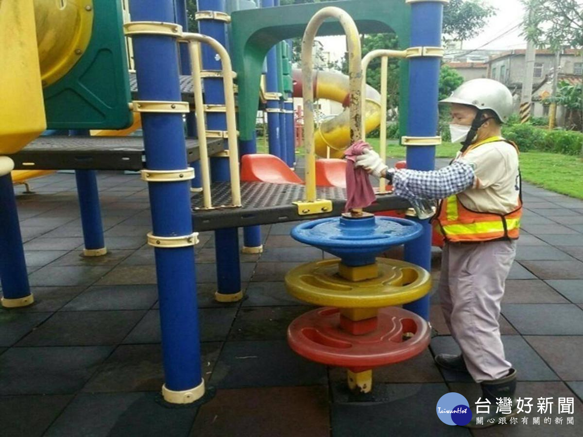 養工處人員針對附設兒童遊戲設施之公園進行環境清消。(圖/記者郭文君攝)