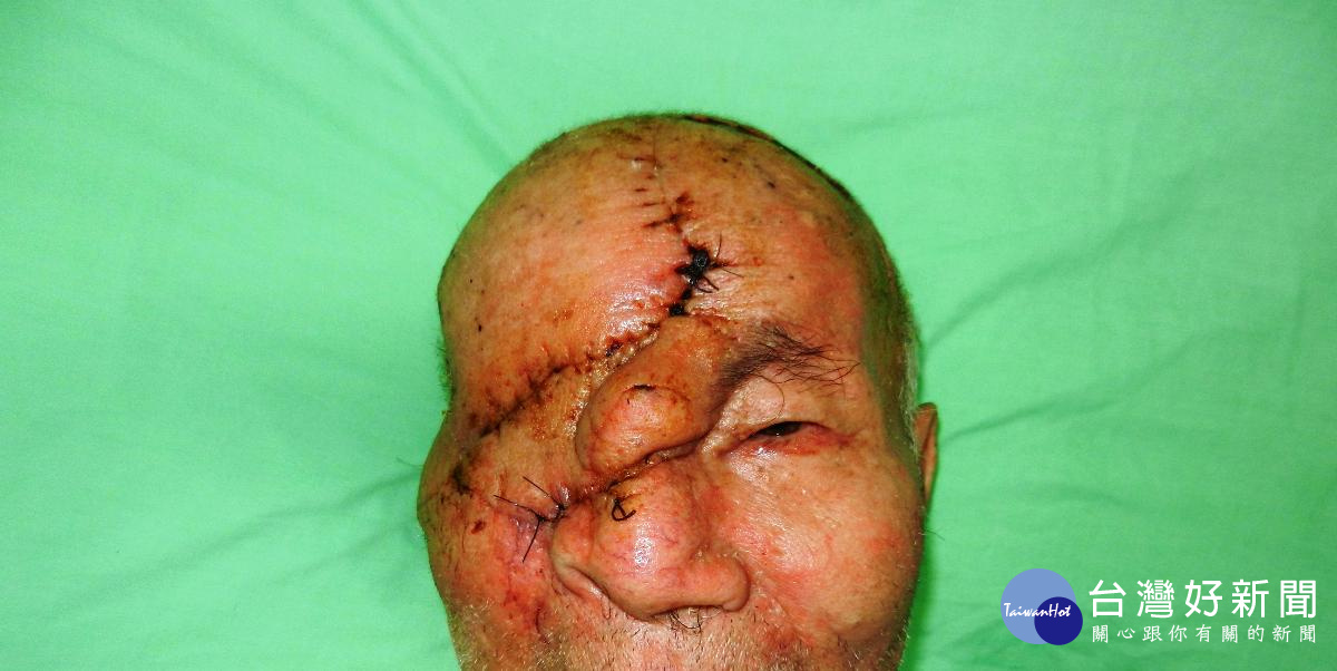 外科醫師呂明川說,右眼球摘除並清除癌細胞後,呈現一個下陷的缺損,一般是大腿取肉進行顯微手術,但老先生年紀大、病況不佳,接縫血管要耗費10個小時以上,全身麻醉的身體恐無法負荷,而且術後要在加護病房靜躺觀察,身體負擔沉重,因此,進行頭部右上方的顳肌皮瓣轉移手術去填補缺損,再取前額皮瓣重建外部。