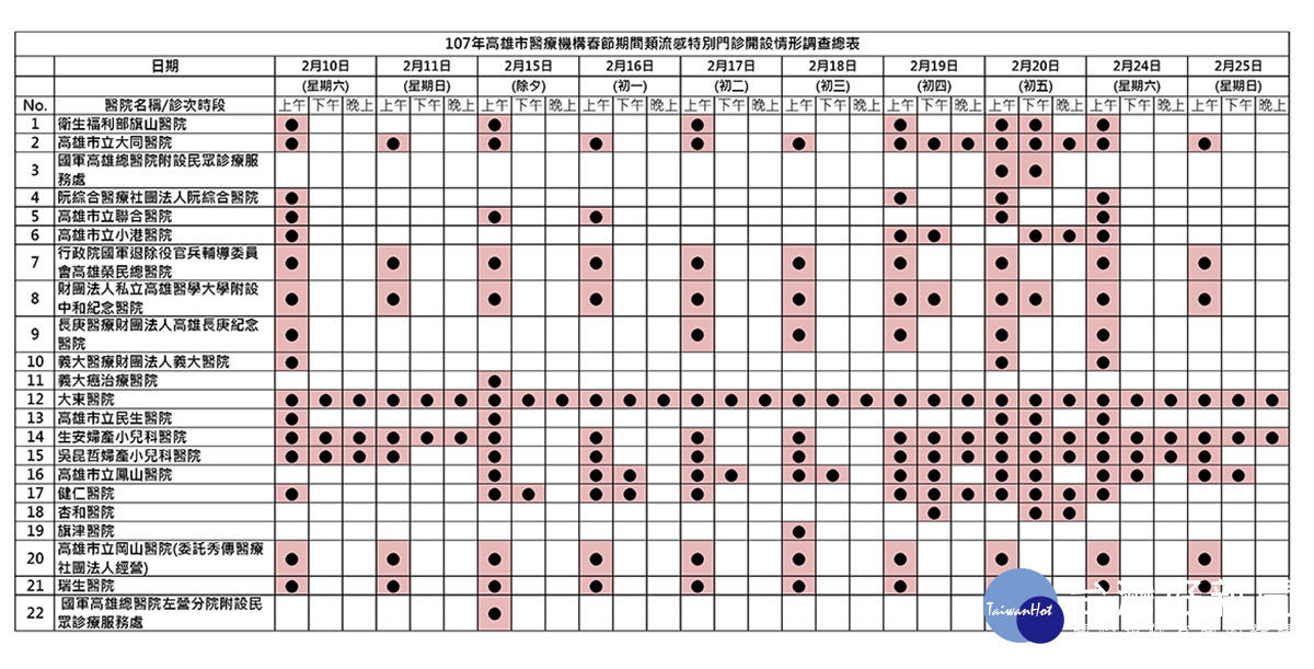 22家醫療院所成立類流感特別門診開診情形。(圖/高雄市政府衛生局提供)